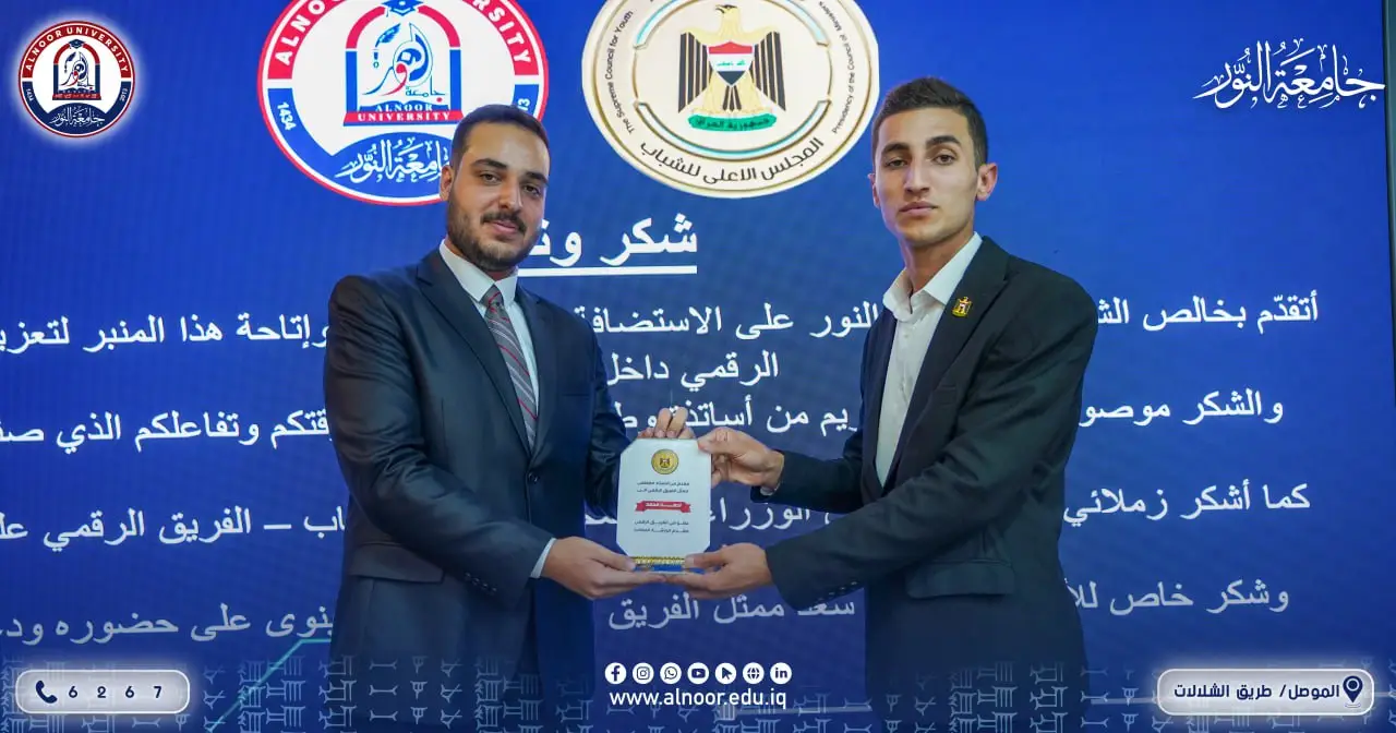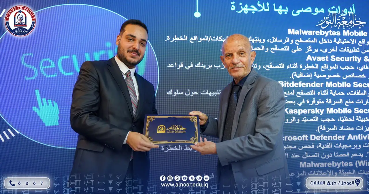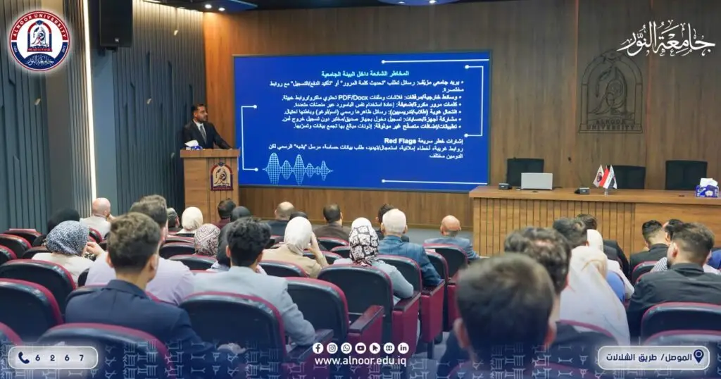 بحضور الاستاذ الدكتور ياسين طه الحجار رئيس جامعة النور والاستاذ الدكتور اسماعيل عبد الوهاب المساعد العلمي لرئيس الجامعة نظمت شعبة التأهيل والتوظيف في رئاسة الجامعة بالتعاون مع قسم تقنيات المختبرات الطبية في كلية التقنيات الصحية والطبية، ، ورشة عمل بعنوان “الوعي السيبراني في البيئة الجامعية”.بحضور نخبة من اعضاء الفريق الرقمي لمجلس الوزراء