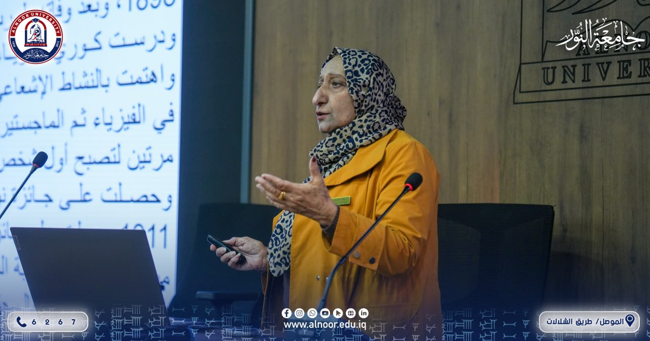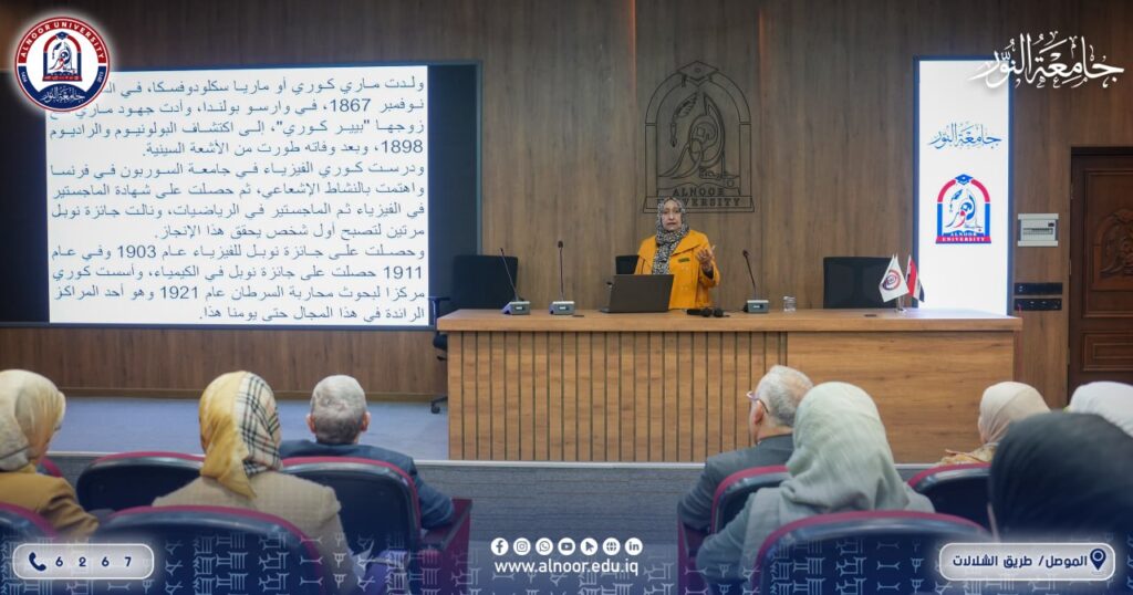 نظم قسم تقنيات الأشعة في كلية التقنيات الصحية والطبية بجامعة النور صباح يوم الأحد الموافق 23/11/2025 حلقة دراسية (سيمنار) بمناسبة اليوم العالمي للفيزياء الطبية. أشرفت على الجلسة وقدّمت محاورها الأستاذة الدكتورة هناء البارودي، رئيسة قسم تقنيات الأشعة، حيث تناولت في محاضرتها تاريخ نشوء النشاط الإشعاعي وتطوره، إضافة إلى علاقته بالفيزياء الطبية ودورهما في تطوير أساليب التشخيص والعلاج.