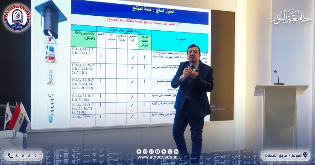 وشهدت الورشة حضور عدد من تدريسيي ومنتسبي القسم، في إطار سعي الكلية إلى تعزيز ثقافة الجودة وضمان استيفاء البرامج الأكاديمية لمتطلبات الاعتماد، بما يسهم في الارتقاء بالمستوى العلمي والمهني للطلبة.