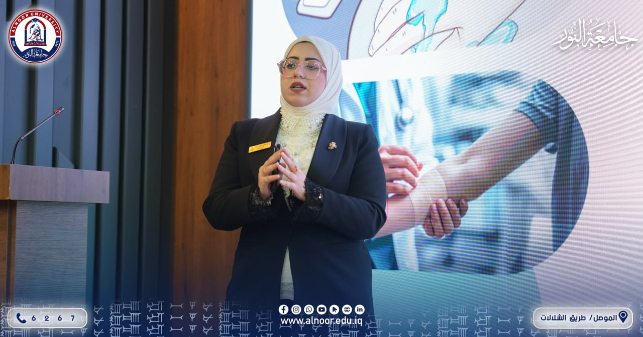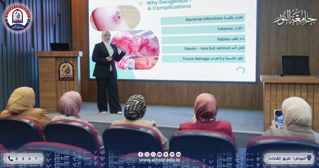 أقام قسم تقنيات المختبرات الطبية في كلية التقنيات الصحية والطبية بجامعة النور بالتعاون مع مركز التعليم المستمر في الجامعة يوم الاحد الموافق 2026/4/19 محاضرة توعوية عن عضات الكلاب وداء الكلب ،ألقتها المدرسة المساعدة حنين محمود راشد وعرضت فيها مقدمة عن عضات الكلاب ،والاسعاف الاولي ،والامراض المنقولة،مع تعريف بداء الكلب واعراضه وانتشاره في العراق ،والوقاية واللقاحات..